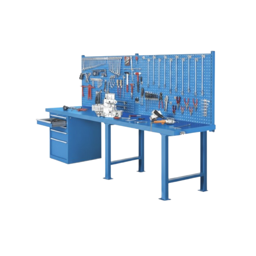 Con una amplia gama de accesorios que incluyen ganchos, ménsulas, paneles porta herramientas, canaleta eléctrica, entre otros, estos bancos se destacan por su capacidad de transformación fácil y rápida. Los pies de acero cuentan con orificios en la parte superior para la fijación del plano de trabajo, así como en las placas de base para una sujeción segura al piso.