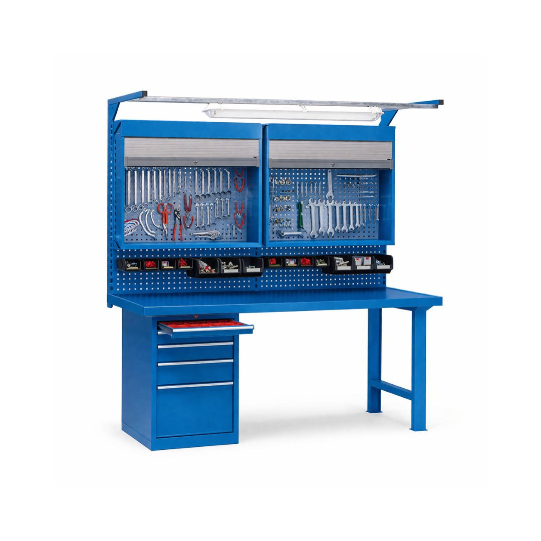 Mesa Metálica de Trabajo – 4 cajones, 2 estantes con gavetas, tubo de luz y 2 armarios